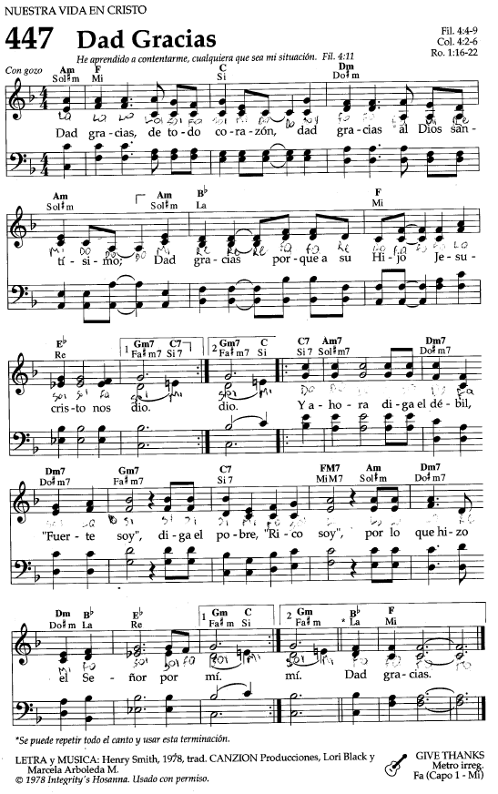 // Dad gracias, de todo corazón;Dad gracias al Dios santísimo;Dad gracias porque a su Hijo Jesucristo nos dio. // // Y ahora diga el débil, ¡Fuerte soy!,Diga el pobre, ¡Rico soy!,Por lo que hizo el Señor por mí. //Dad gracias.